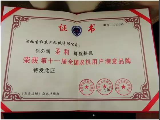 圣和公司生產(chǎn)的旋耕機(jī)榮獲“第十一屆全國農(nóng)機(jī)用戶滿意品牌"大獎!