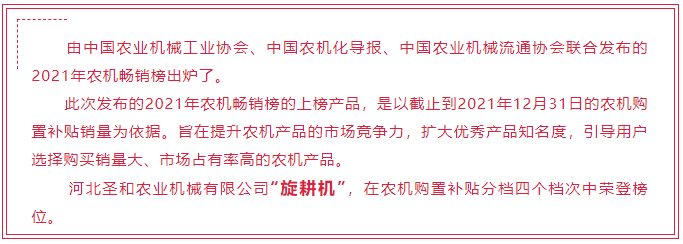 2021年中國農(nóng)機(jī)暢銷榜發(fā)布——圣和旋耕機(jī)榮登榜位